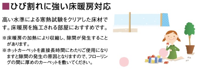 ●木には自然の調湿機能とこれに伴う伸縮性があります。床材の伸縮に伴い、反りや突き上げ(継ぎ目部分が盛り上がる現象)、目スキ(継ぎ目部分に隙間が出来る現象)が生じることがあります。特に床暖房使用時には目スキが生じやすくなりますが、使用しなくなると徐々に隙間が小さくなります。